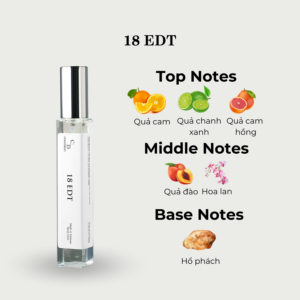 Một mùi hương đem đến sự tự do, phóng khoáng, đầy gió và nước. Hỗn hợp mùi hương này được hình thành từ sự hòa hợp hoàn hảo giữa mùi hương ngòn ngọt mằn mặn của nước biển và ánh nắng ấm áp mơn trớn trên làn da của bạn. 18 EDT cho ta hình dùng về một nơi có chút nắng và gió. Hương cam quýt đăng đắng với hương thơm của hương hoa lan và quả đào. Tầng hương cuối ấm nhẹ của hổ phách làm cho các mùi hương trở nên mềm mại hơn.