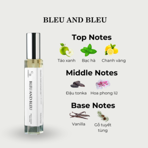 Bleu And Bleu thể hiện sự mạnh mẽ nam tính thông qua sự kết hợp tinh tế của hương lá bạc hà tươi, vỏ chanh và táo xanh. Hương thơm nền gây nghiện bởi sự pha trộn của một số thành phần hương hoa phương Đông hấp dẫn đậu tonka, hoa phong nữ. Cùng với một chút thành phần hương đặc trưng của hương gỗ như gỗ tuyết tùng và vani thêm sự quyến rũ, tinh tế và đam mê cho phái mạnh.