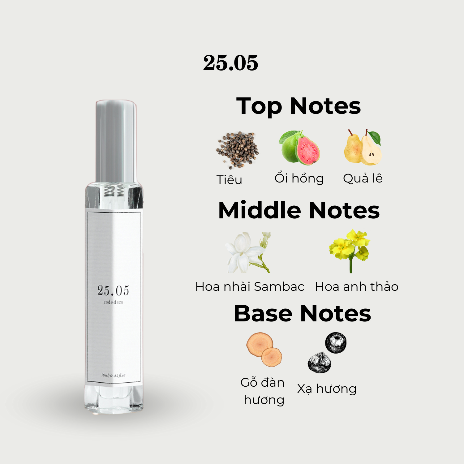 Tổng thể của 25.05 là sự kết hợp khéo léo của hương hoa và trái cây. 25.05 mở màn với hương trái cây, ổi hồng mà mùi hương ta cảm nhận rõ nhất ở tầng hương đầu tạo nên sự thanh mát, tươi mới và sảng khoái. Được nhấn nhá thêm chút nồng say rất nhẹ từ Tiêu. Chỉ ít phút sau, mùi hương chuyển mình đưa ta đến với sự nữ tính, yểu điệu và trong trẻo của hương hoa Nhài và Anh Thảo. Nốt hương cuối đọng lại sự ấm áp nhẹ nhàng đầy quyến luyến từ Xạ Hương và gỗ Đàn Hương.