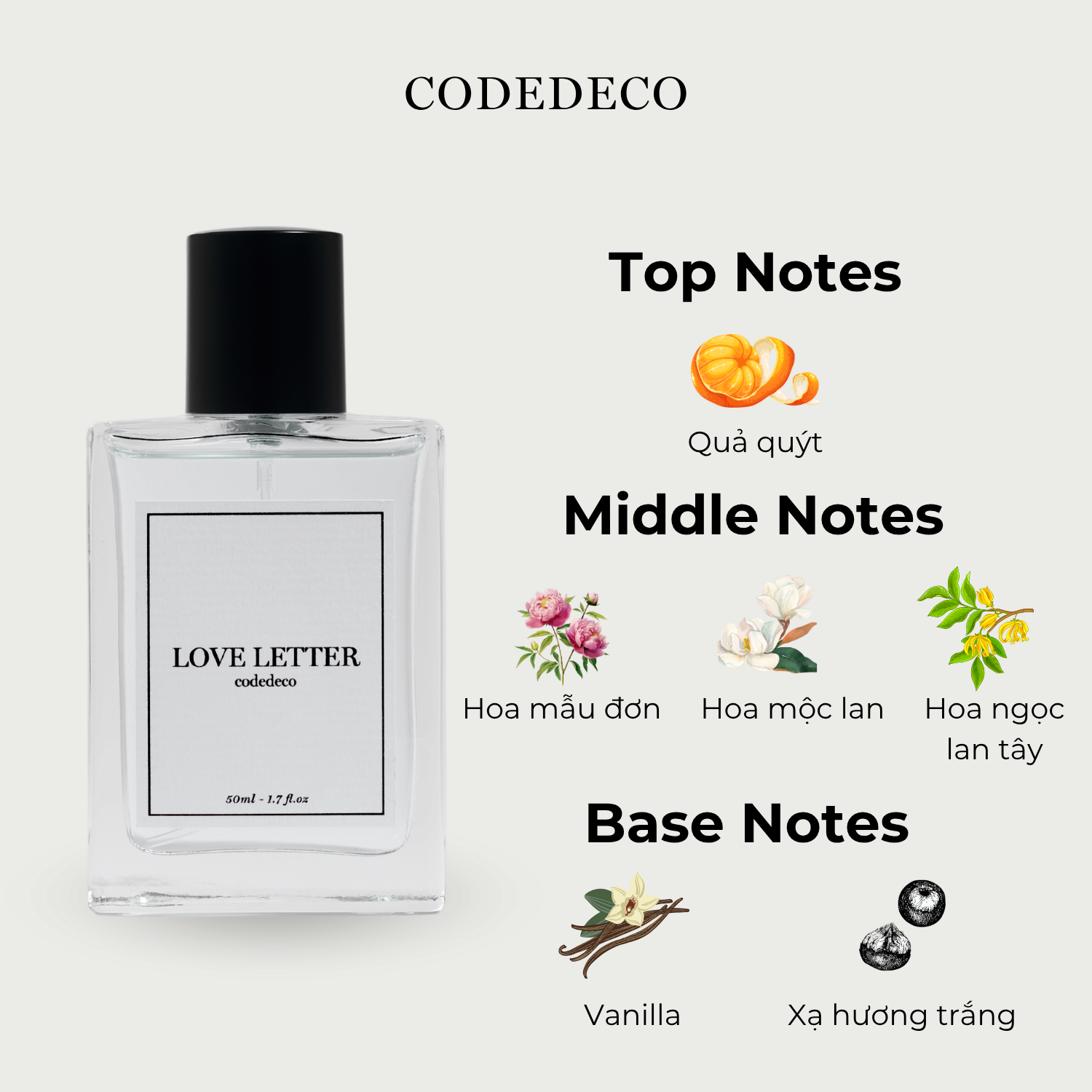 CODEDECO Love Letter là mùi hương thuộc nhóm Amber Floral (Hoa cỏ Phương Đông), nơi sự tinh khôi của hương hoa cỏ tao nhã hòa quyện cùng nét ấm áp, quyến rũ của vanilla và xạ hương trắng. Như một bức thư tình ngọt ngào, Love Letter mang đến cho phái đẹp sự nữ tính, trong trẻo nhưng vẫn gợi cảm và đầy sức hút.